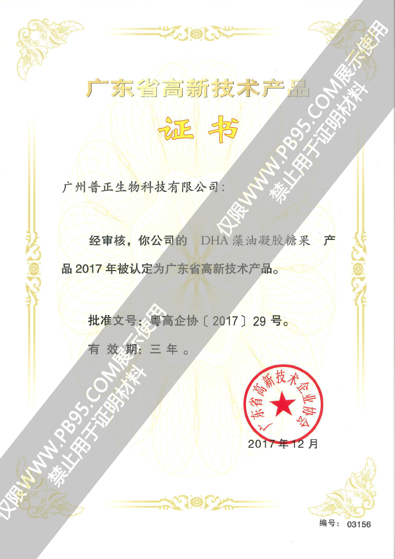 DHA藻油凝膠糖果——17年高新技術(shù)產(chǎn)品證書