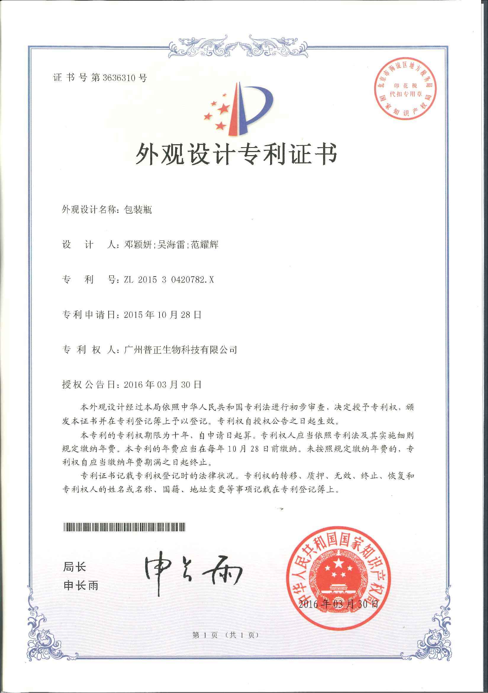 普正包裝專利證書(專利號(hào):ZL201530420782.X)